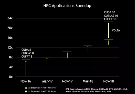 例如,在包含 11 個(gè)高性能計(jì)算應(yīng)用程序的組合中,對(duì)于采用4個(gè)NVIDIA Tesla P100 GPU的服務(wù)器,其當(dāng)前的運(yùn)行速度比兩年前提高了2倍。如果同時(shí)改進(jìn)軟件堆棧和GPU架構(gòu),您可以獲得更大的性能提升。